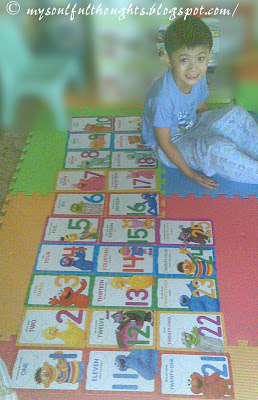 I bought a box of Sesame St. number cards at the mall several months ago. Yohan already learned how to identify numbers in his Nursery class. In Kindergarden, I was told that students will learn how to spell numbers 1-20. I thought it was a good idea to teach him to spell a few numbers during summer vacation so I brought out the Sesame St. cards. Yohan carefully arranged them in order as you can see in the photo below.