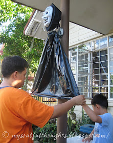 Last Saturday evening, we had an early Halloween celebration at the village. We didn't have time to buy some decorations but we made do with the available materials at home. We used two identical masks and placed them on our lamp posts outside the main door. We used black garbage bags as bodies. Yohan helped his Dad put up a few happy looking ghosts. :)